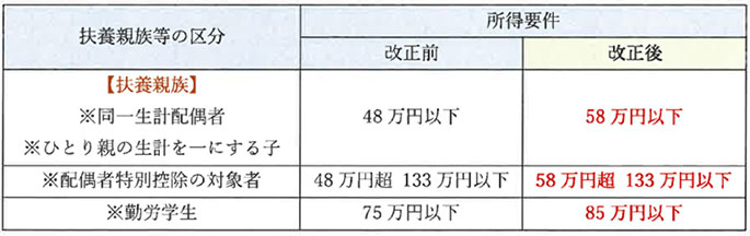 扶養親族に関しては合計所得金額が58万円以下になりました。年収で考えるならば、【給与所得控除】の改正と合わせて…