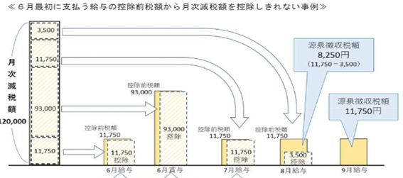 この事例は、減税額は納税者1人配偶者1人扶養親族2人の120,000円であり、減税額が最初に支払う6月給与の控除前税額11,750円を超えるため、6月給与で控除しきれなかった部分の減税額は、以後支払う6月賞与、7月給与、8月給与に係る控除前税額から順次控除します。分割で減税していき、月毎で減税額の大きさも変わるので場合によっては手取りが増加した実感が薄く感じる方もいるかもしれませんね。